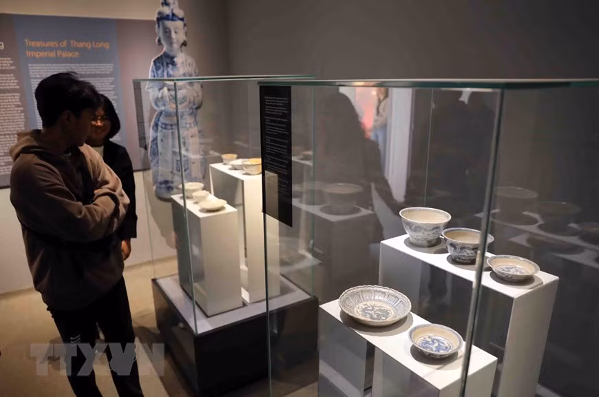 Khách tham quan chiêm ngưỡng bộ sưu tập bát, đĩa gốm hoa lam ngự dụng thời Lê sơ, niên đại thế kỷ 15-đầu thế kỷ 16; hiện lưu giữ tại Trung tâm Bảo tồn di sản Thăng Long-Hà Nội.