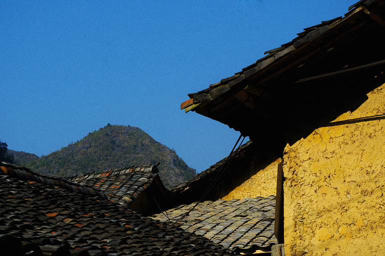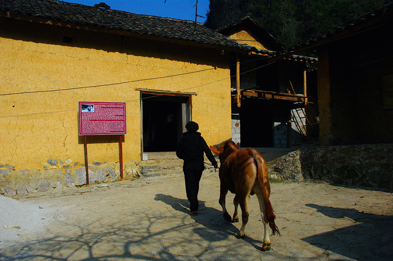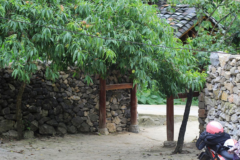 Cánh cổng gỗ dẫn vào nhà Pao, hai bên là tường rào đá đặc trưng của đồng bào Mông nơi đây, hoàn toàn dựng từ đá tảng xếp chồng lên nhau mà không cần xi măng, vôi vữa. Và giống như muôn vạn ngôi nhà ở cao nguyên đá Đồng Văn, bên hông bờ rào đá được trồng đào, trồng mận. Mùa xuân ra hoa kín cổng, còn mùa hè là mùa ra trái.