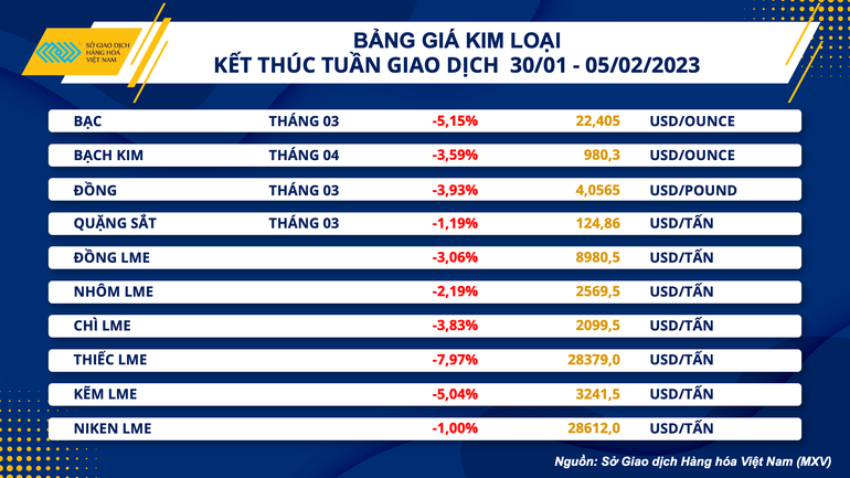 Thị trường kim loại trải qua một tuần giao dịch đầy khó khăn khi hầu hết các mặt hàng đều lao dốc. Với nhóm kim loại quý, giá bạc giảm 5,15% về 22,41 USD/ounce, còn giá bạch kim đánh mất mốc 1000 USD với mức giảm 3,59% về 980,3 USD/ounce.