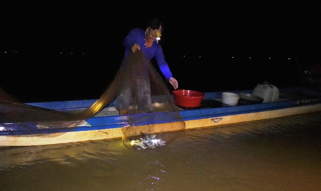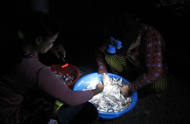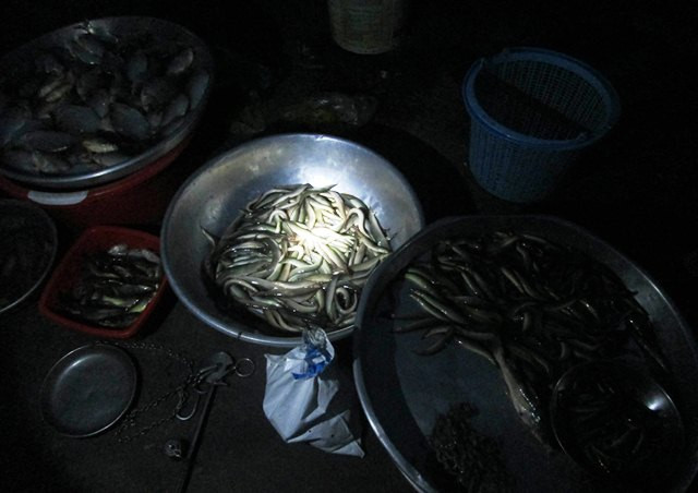Mỗi người một chiếc đèn pin trên tay, trên đầu, chỉ thấy cá chứ không rõ mặt người.