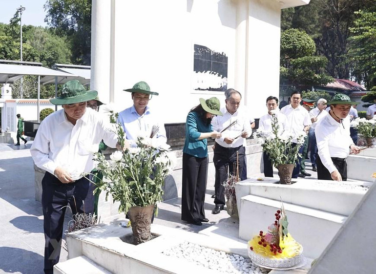 Chủ tịch nước Nguyễn Xuân Phúc và các đại biểu tại Nhà bia tưởng niệm các liệt sĩ thanh niên xung phong toàn quốc.