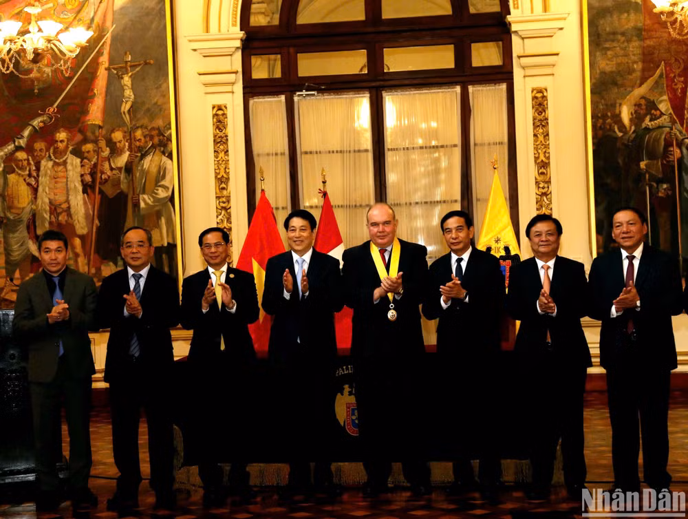 [Ảnh] Tổng thống Peru trao tặng Huân chương “Mặt trời Peru” cấp Đại Thập tự cho Chủ tịch nước Lương Cường