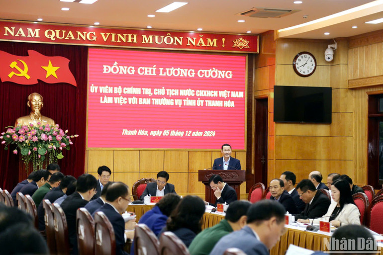Phát biểu kết luận tại buổi làm việc, Chủ tịch nước Lương Cường khẳng định trong những năm qua, tỉnh Thanh Hóa luôn nhận được sự quan tâm hỗ trợ, giúp đỡ rất lớn của Trung ương Đảng, Quốc hội, Chính phủ; với nhiều chủ trương, cơ chế, chính sách quan trọng đã được ban hành nhằm phát huy mọi tiềm năng, lợi thế để tỉnh phát triển nhanh và bền vững. Từ đầu nhiệm kỳ Đại hội Đảng bộ tỉnh lần thứ XIX đến nay, mặc dù gặp nhiều khó khăn, thách thức nhưng Đảng bộ, chính quyền, nhân dân tỉnh Thanh Hóa đã đoàn kết, quyết tâm cao, nỗ lực lớn, hành động quyết liệt, đạt được nhiều kết quả khá toàn diện trên các lĩnh vực, góp phần quan trọng vào thành tựu chung của cả nước.