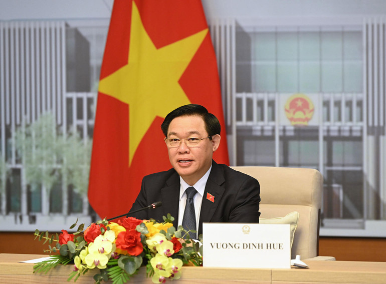 | Chủ tịch Quốc hội Vương Đình Huệ phát biểu tại buổi hội đàm trực tuyến với Chủ tịch Nhân đại Trung Quốc Triệu Lạc Tế. |