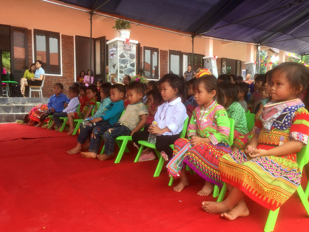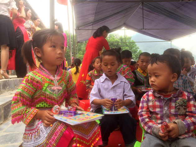Khoảng hơn hai chục bé mẫu giáo, có bé mặt mũi vẫn còn lấm lem nước mũi, tròn mắt xem màn biểu diễn của các bạn đồng trang lứa. Có lẽ, đây là lần đầu tiên trong đời, các bé được tham dự một buổi lễ lớn như thế, với cờ hoa, rạp dựng, nhạc rộn rã khắp một vùng. Đó cũng là lần đầu tiên, các bé bỡ ngỡ bước vào ngôi trường đẹp như trong mơ, được xây dựng cho chính các em.