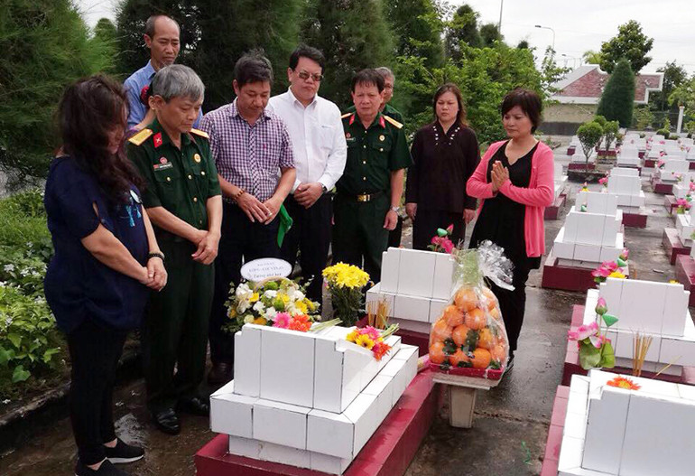 Ông Huấn cùng thân nhân gia đình liệt sĩ, bạn chiến đấu, bạn cùng lớp thời cấp 3 (Trường PTTH Chu Văn An – Hà Nội) bên mộ liệt sĩ Đặng Trần Cảnh tại Nghĩa trang Liệt sĩ tỉnh Kiên Giang.