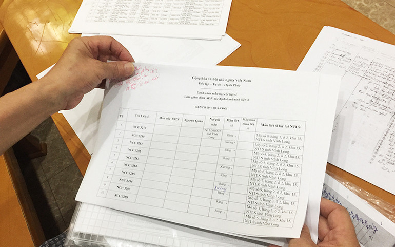Bản danh sách mẫu hài cốt liệt sĩ gửi Viện Pháp y Quân đội làm giám định để xác định danh tính liệt sĩ.