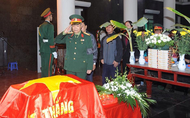 Ông Huấn thực hiện nghi thức chào theo điều lệnh quân đội trước linh cữu liệt sĩ Vũ Duy Hùng trong lễ đón, truy điệu tại Hà Nội tháng 12-2017.