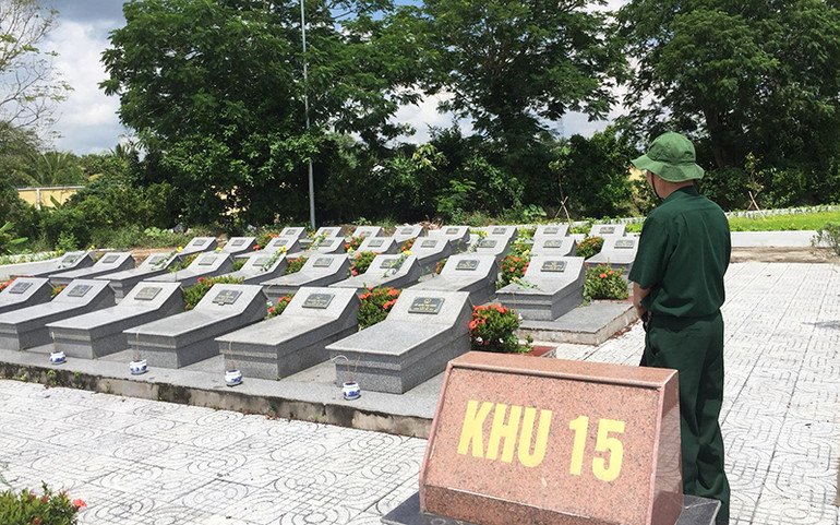 Cựu chiến binh Trần Tường Huấn tại Nghĩa trang Liệt sĩ tỉnh Vĩnh Long, nơi quy tập 22 ngôi mộ “liệt sĩ chưa biết tên”.