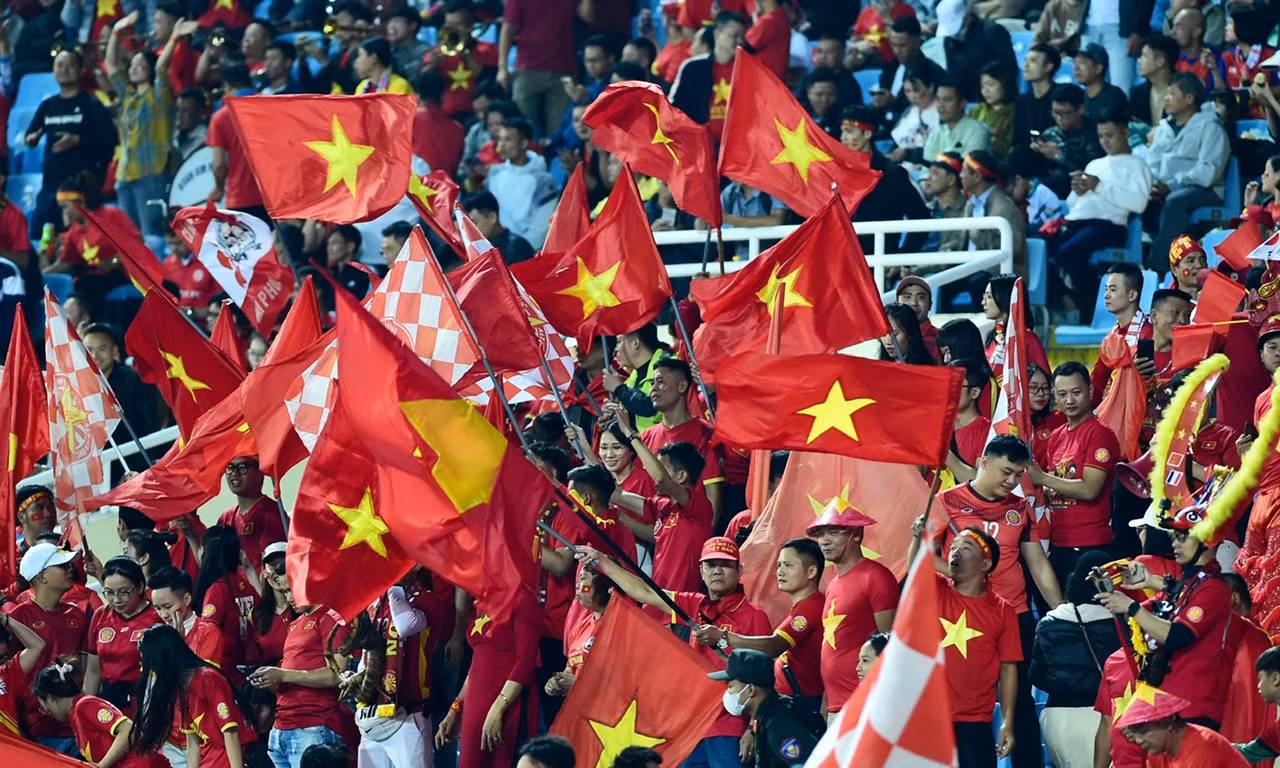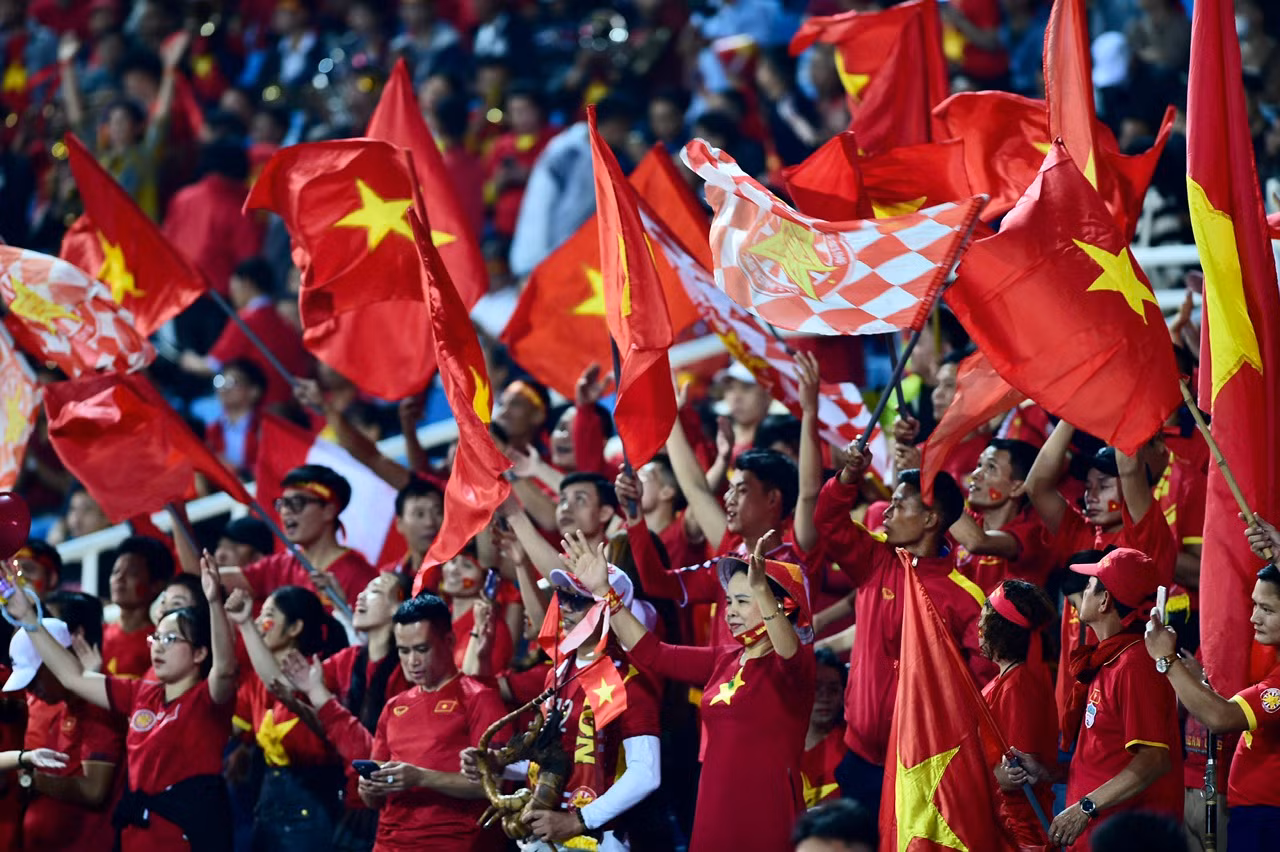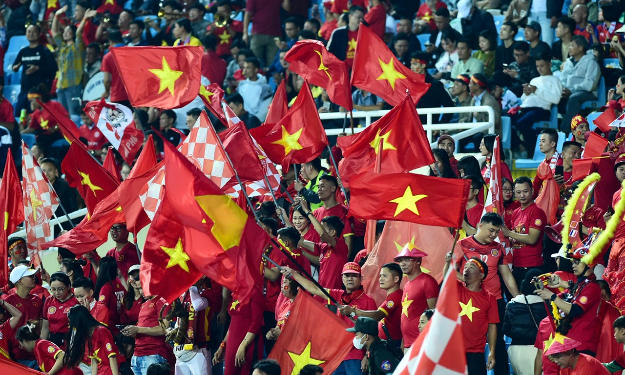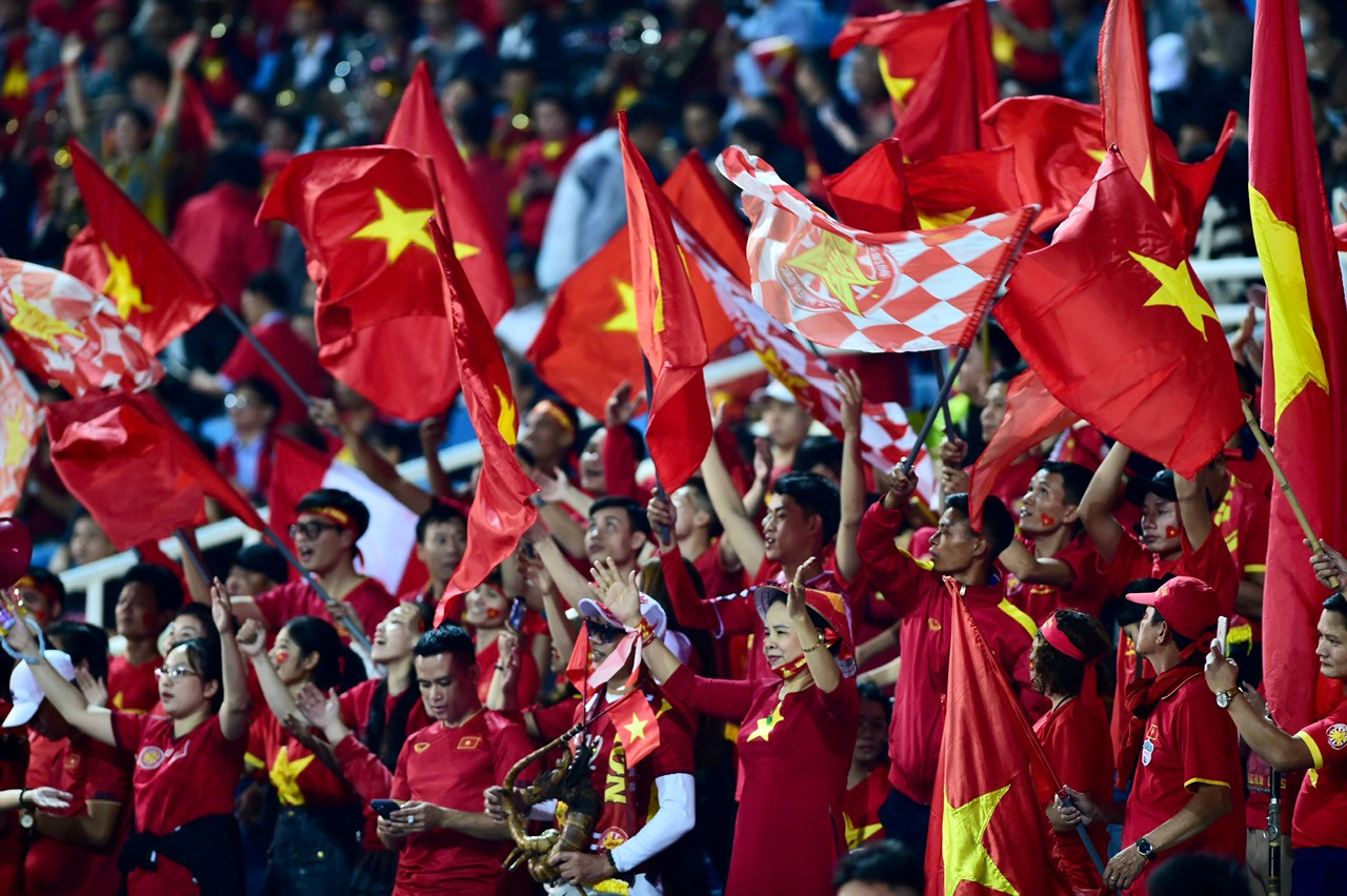 | Các cổ động viên mang sắc đỏ có mặt tại “chảo lửa” Mỹ Đình để cổ vũ cho đội quân của thầy trò huấn luyện viên Troussier. |