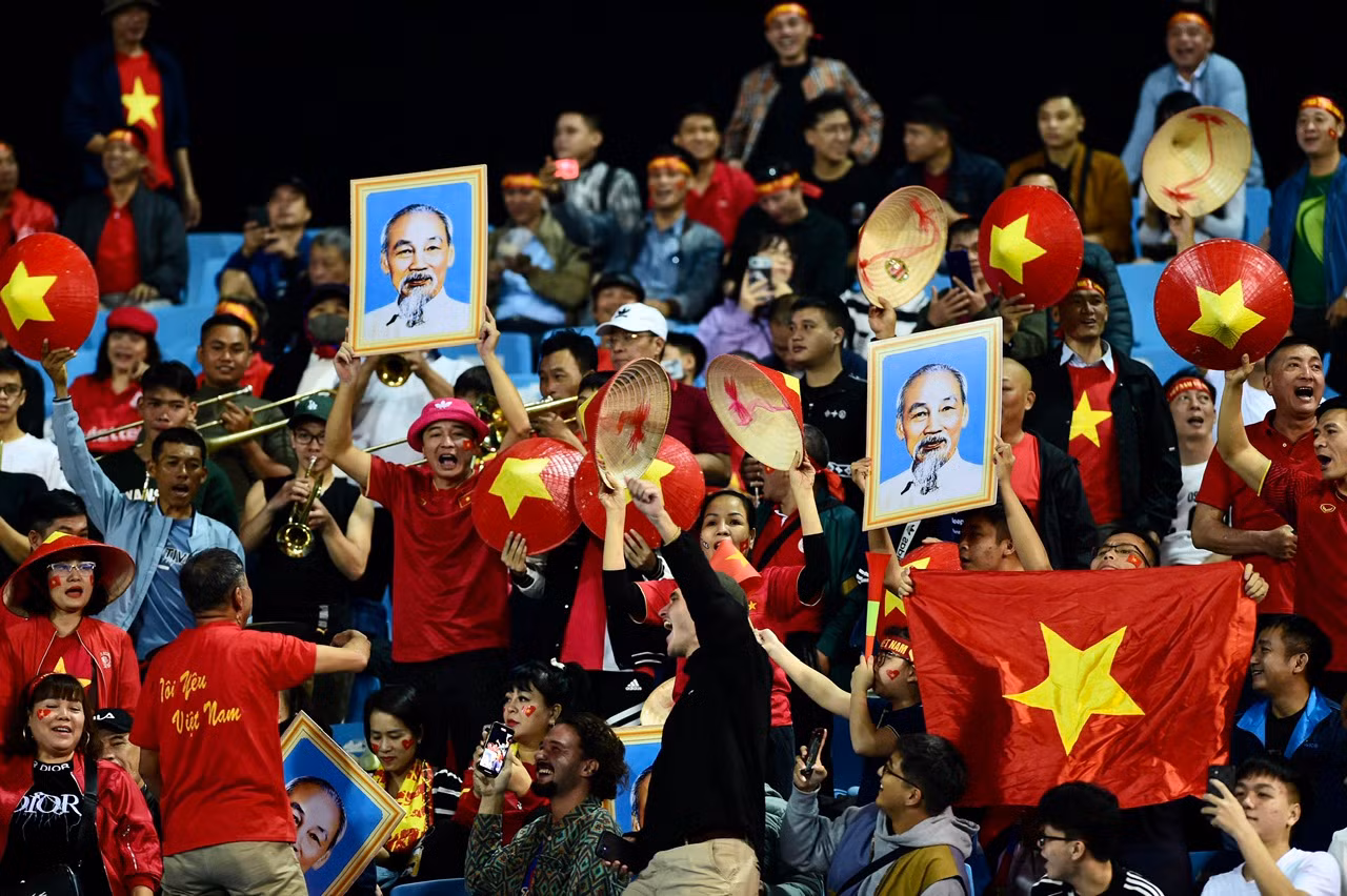 | Những tấm băng-rôn, khẩu hiệu, ảnh Bác Hồ trên tay thể hiện tình yêu bóng đá mãnh liệt của người Việt Nam trước giờ bóng lăn. |