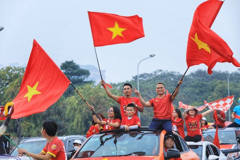 Cổ động viên diễu hành trên đường phố để cổ vũ đội tuyển Việt Nam trước trận đấu gặp đội tuyển Indonesia.