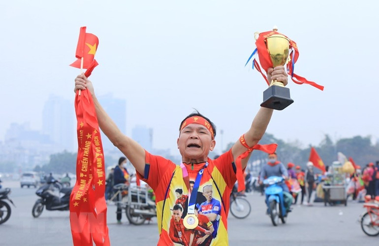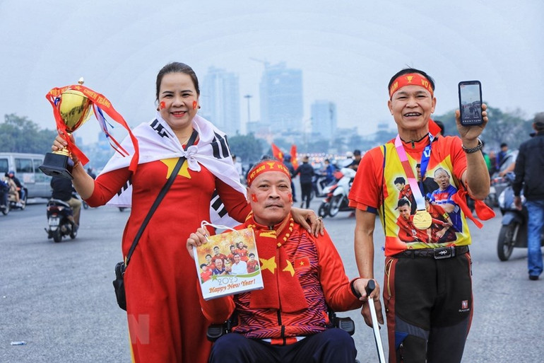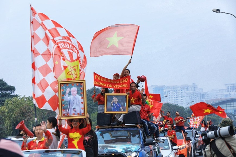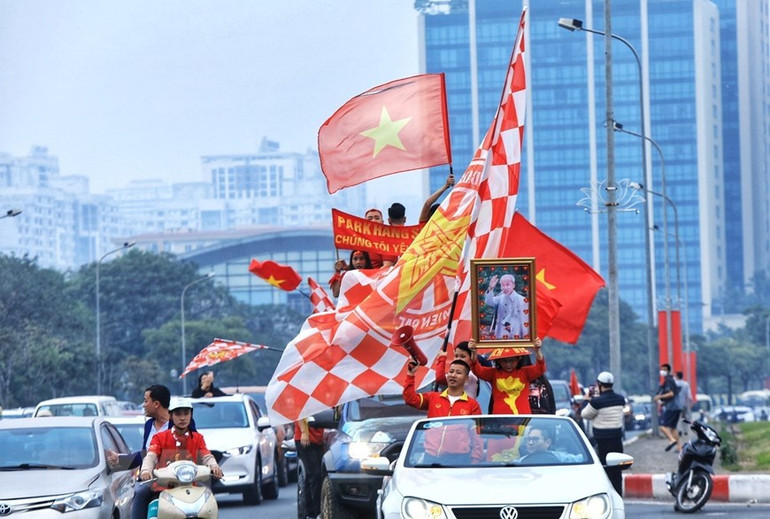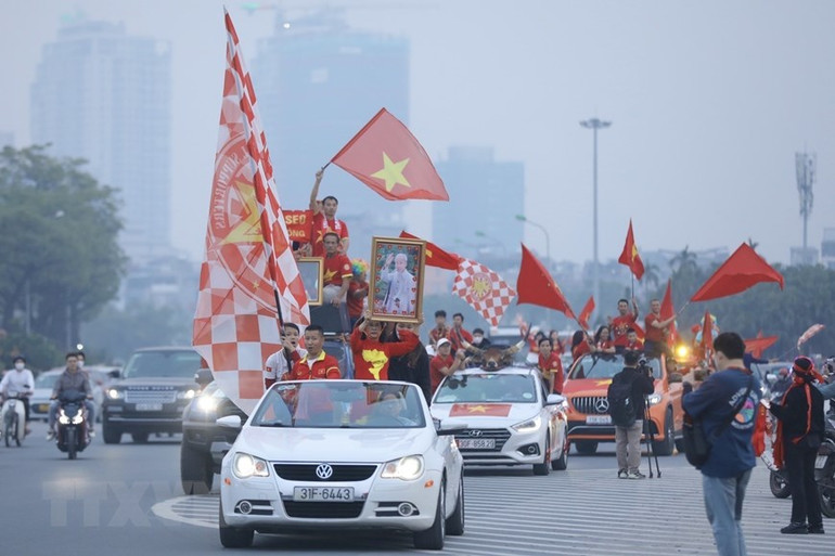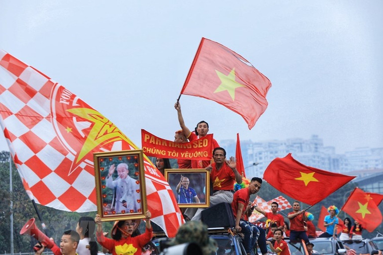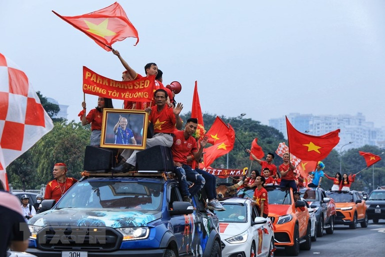 Cổ động viên diễu hành trên đường phố để cổ vũ đội tuyển Việt Nam. (Ảnh: TTXVN)