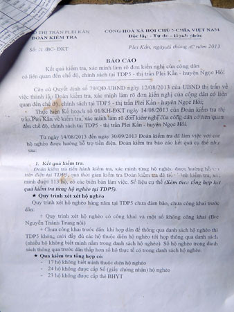 Ngay sau khi thông tin nhiều hộ trong danh sách nghèo không được cấp Giấy Chứng nhận hộ nghèo, không được cấp thẻ bảo hiểm y tế, tiền điện hỗ trợ…trong suốt ba năm qua, lãnh đạo thị trấn Plây Cần đã thành lập đoàn kiểm tra. Kết quả xác minh ban đầu cho thấy (biên bản số 01/BC-ĐKT ngày 28-10-2013) có 17 hộ không biết mình thuộc diện hộ nghèo, 24 hộ không được cấp sổ, 23 hộ không được cấp thẻ bảo hiểm…cùng hàng chục triệu đồng chi hỗ trợ tiền điện nhưng chưa chi.