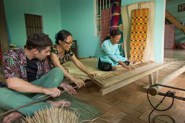 Du khách nước ngoài trải nghiệm dệt chiếu ở Triêm Tây.
