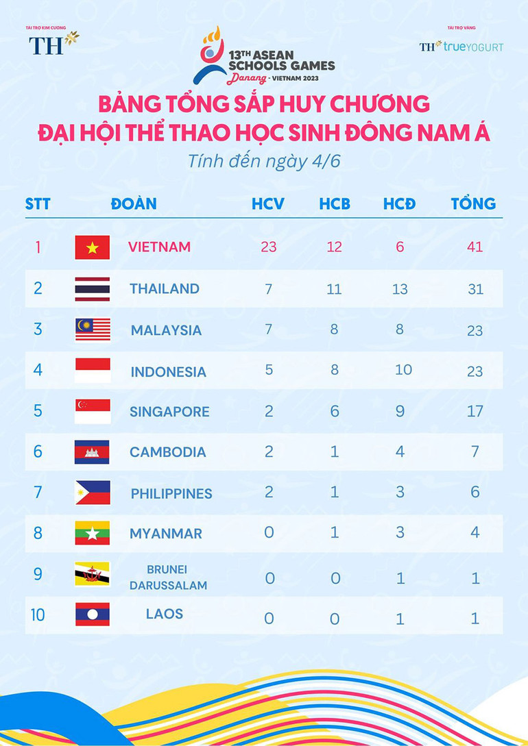 Đặc biệt, hôm qua, đội tuyển điền kinh học sinh Việt Nam đã xuất sắc đoạt thêm 4 Huy chương Vàng ở các nội dung: chạy 1.500m nữ, nhảy cao nam, nhảy xa nữ và chạy 400m nữ với sự xuất sắc của các vận động viên Hoàng Thị Ngọc Anh, Nguyễn Thành Phát, Hà Thị Thúy Hằng và Lê Thị Tuyết Mai. Như vậy, trong 2 ngày thi đấu, điền kinh Việt Nam đã đoạt 9 Huy chương Vàng cho Đoàn thể thao Việt Nam.