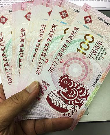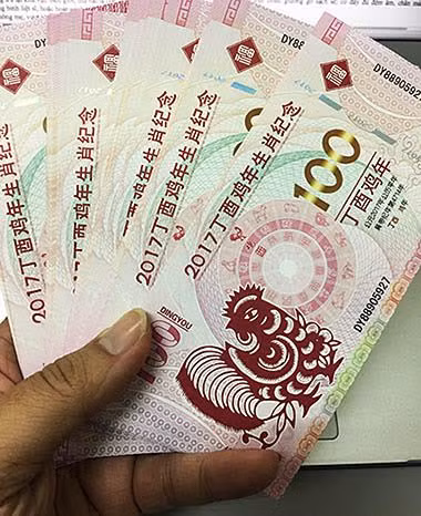 Nằm trong số những loại tiền in hình gà sưu tầm rẻ nhất, đang được các “thương lái” bán với giá từ 20 đến 25 nghìn đồng/tờ là tờ 100 Patacas do Ngân hàng Macao (Trung Quốc) phát hành. Đây là loại tiền giấy có mục đích kỷ niệm năm mới Đinh Dậu 2017, không có giá trị lưu hành, ngay cả ở Macao. Bên cạnh đó là đủ loại tiền kỷ niệm của Macao như tiền xu hình gà, tiền giấy 10 Patacas…