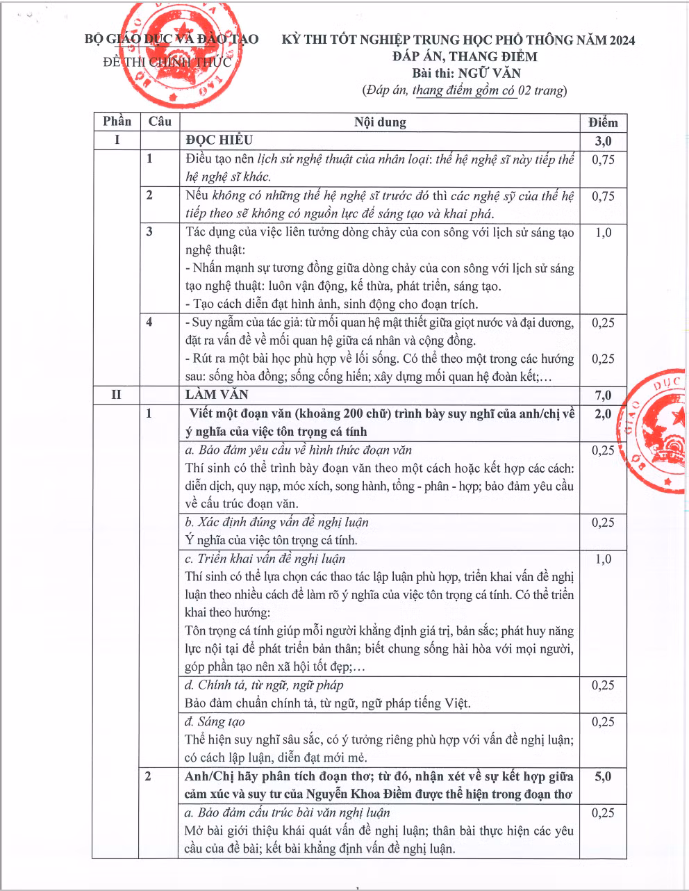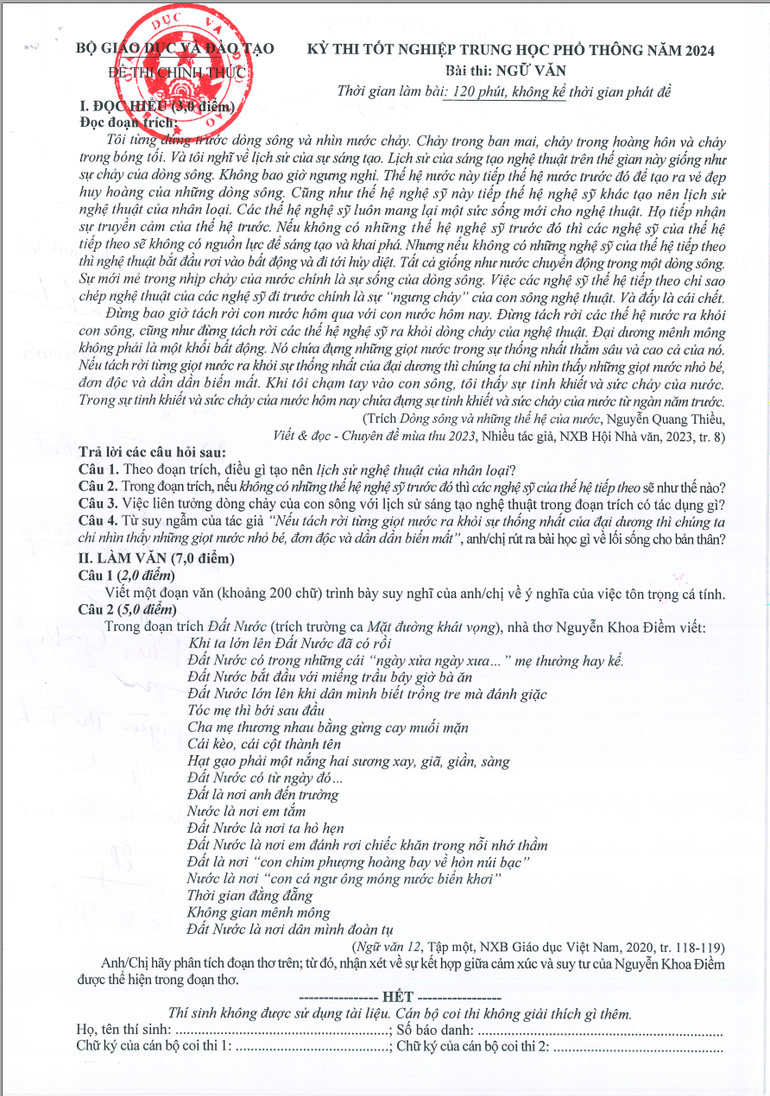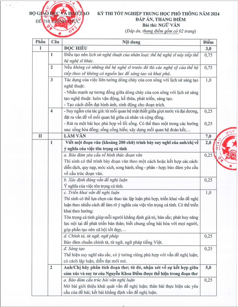 Đề thi chính thức, đáp án và thang điểm bài thi Ngữ văn Kỳ thi tốt nghiệp THPT năm 2024: