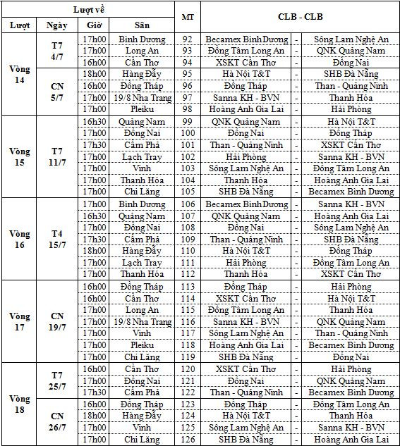 NDĐT - Hôm nay 17-12, Công ty Cổ phần Bóng đá Chuyên nghiệp Việt Nam (VPF) đã ban hành Lịch thi đấu chính thức của Giải bóng đá Vô địch quốc gia - V-League năm 2015. NDĐT xin gửi đến độc giả chi tiết Lịch thi đấu để tiện theo dõi.