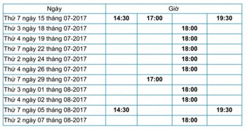 Chương trình chiếu ra mắt phim vào 8 giờ 30 phút, thứ sáu, ngày 14-7; phim được trình chiếu từ ngày 15- 7 đến 7-8.