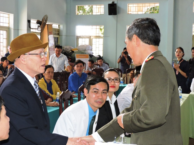 Đại tá Nguyễn Thế Lực, Phó Giám đốc Công an tỉnh Đác Lắc đến chào ông Nguyễn Lâm Sáu sau buổi công khai xin lỗi.