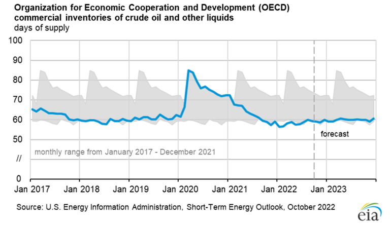 Mức tồn trữ nhiên liệu tại các quốc gia thuộc Tổ chức Hợp tác và Phát triển Kinh tế (OECD) hiện ở mức thấp nhất trong 5 năm trở lại đây và được dự báo sẽ tiếp tục ở mức thấp kỷ lục trong cả năm 2023 (Nguồn: Cơ quan Thông tin Năng lượng Hoa Kỳ - EIA)