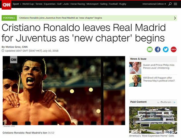 Đêm 10-7 (theo giờ Việt Nam), nhiều tờ báo trên thế giới đồng loạt đưa tin xác nhận thương vụ của CR7. “Sau chín năm, 16 danh hiệu và 451 bàn thắng, Cristiano Ronaldo rời Real Madrid. Ngôi sao 33 tuổi người Bồ Đào Nha gia nhập đương kim vô địch Serie A Juventus từ nhà vô địch Champions League với mức phí chuyển nhượng khoảng 117 triệu đô-la”, Hãng thông tấn Mỹ CNN đưa tin.