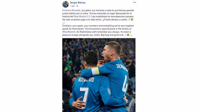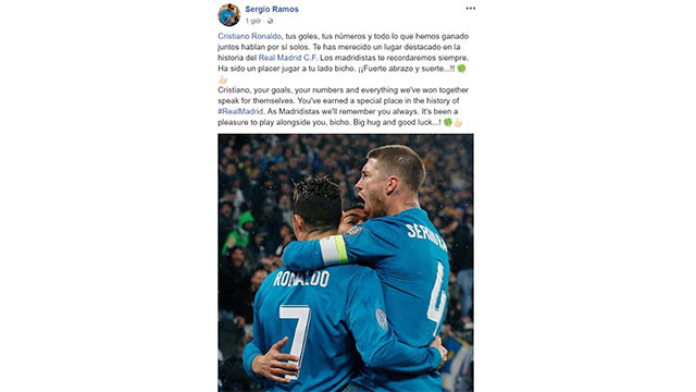 Đội trưởng CLB và cũng là người bạn thân của Ronaldo là trung vệ Sergio Ramos nói lời chia tay: “Cristiano Ronaldo, những bàn thắng, những con số cùng mọi thứ chúng ta giành được cùng nhau đã nói lên tất cả. Cậu xứng đáng có một vị trí nổi bật trong lịch sử của CLB Real Madrid. Các madridistas chúng tôi sẽ luôn mãi nhớ về cậu. Thật vinh hạnh được thi đấu bên cạnh cậu. Một cái ôm thật chặt và chúc may mắn!”.