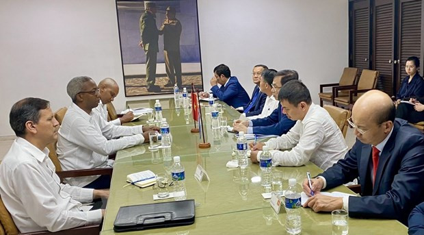 Đoàn đại biểu Ban Đối ngoại Trung ương Đảng gặp và trao đổi với Bí thư Trung ương Đảng, Trưởng Ban Kinh tế và Sản xuất Trung ương Joel Queipo Ruiz. (Ảnh: Mai Phương/TTXVN)