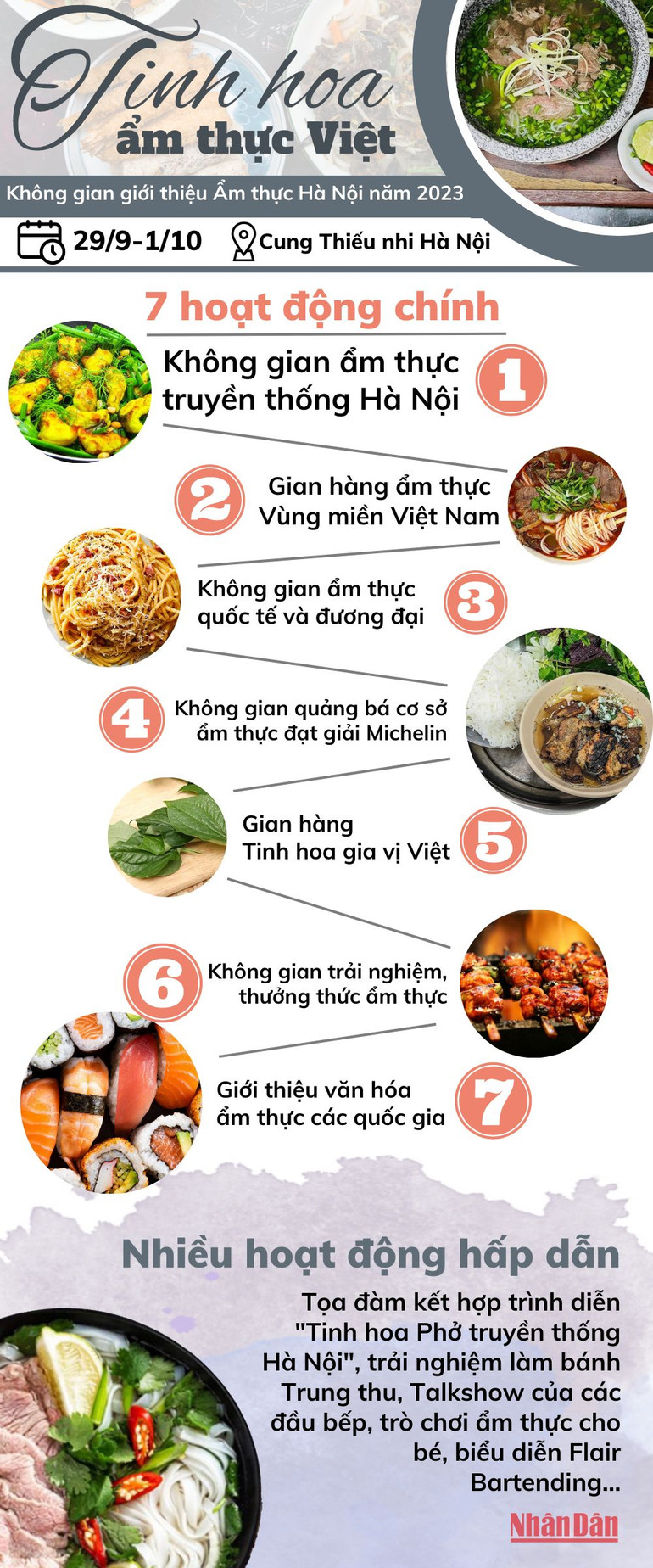 Không gian giới thiệu Ẩm thực Hà Nội, với chủ đề "Tinh hoa ẩm thực Việt", sẽ diễn ra từ ngày 29/9 đến 1/10 tại Cung Thiếu nhi Hà Nội (36-38 Lý Thái Tổ, Hoàn Kiếm), nhằm quảng bá giá trị ẩm thực với tư cách một sản phẩm du lịch đặc sắc của Thủ đô tới người dân, du khách trong và ngoài nước. Hoạt động này diễn ra cùng thời điểm với Festival Thu Hà Nội 2023.