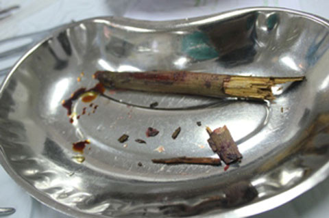 Trưởng khoa Ngoại bác sĩ Trần Đức Dũng – trưởng kíp mổ, cho biết: Đây là ca mổ phức tạp, rất có thể dễ bị nhiễm trùng sau mổ do có rất nhiều mảnh vỡ của thanh gỗ bám vào màng tim và lỗ thủng của phổi. Trong quá trình phẫu thuật, kíp mổ phải soi, nhặt từng mảnh vỡ một cách tỷ mỷ…