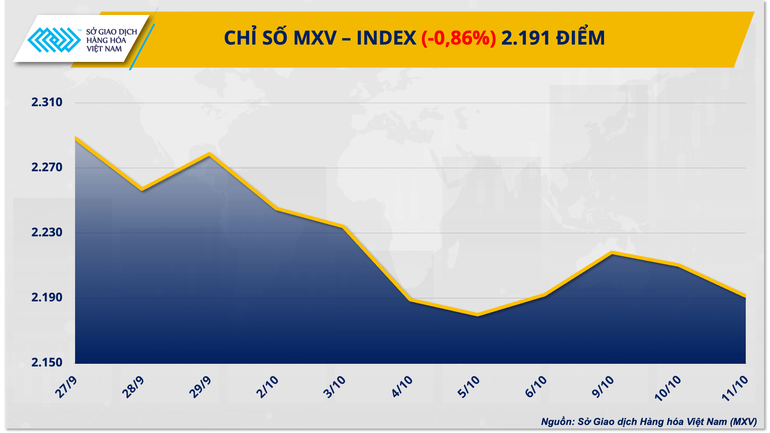 Tuy nhiên, lực bán chiếm ưu thế khi nhiều mặt hàng quan trọng ghi nhận các mức giảm mạnh, kéo chỉ số MXV-Index tiếp tục giảm 0,86% xuống 2.191 điểm.