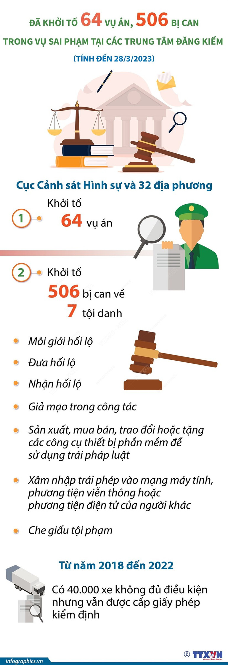 Liên quan đến việc xử lý sai phạm tại các Trung tâm đăng kiểm, tại họp báo chiều 28/3, Trung tướng Tô Ân Xô, Người Phát ngôn Bộ Công an cho biết, Cục Cảnh sát Hình sự và 32 địa phương đã khởi tố 64 vụ án, 506 bị can về 7 tội danh khác nhau.