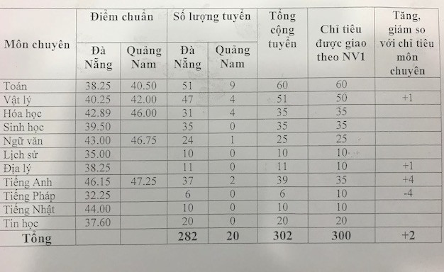 So với năm 2016, điểm chuẩn vào lớp 10 năm nay đều tăng cao. Kỳ thi tuyển sinh vào lớp 10 THPT năm 2017 tại thành phố Đà Nẵng có 11.313 thí sinh dự thi. Chỉ tiêu tuyển sinh vào các trường THPT công lập trên toàn thành phố là 9.200 học sinh. Đối với trường THPT Chuyên Lê Quý Đôn có 1.225 thí sinh, đăng ký dự thi vào 11 môn chuyên, chỉ tiêu tuyển sinh là 302, tăng 02 thí sinh so với chỉ tiêu đề ra (trong đó, 282 chỉ tiêu tại Đà Nẵng và 20 chỉ tiêu là học sinh tỉnh Quảng Nam).