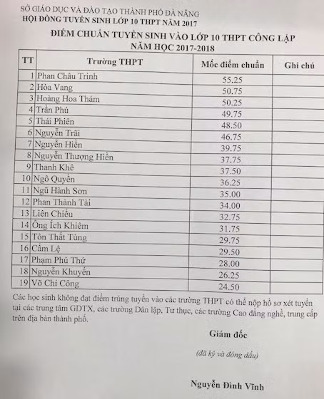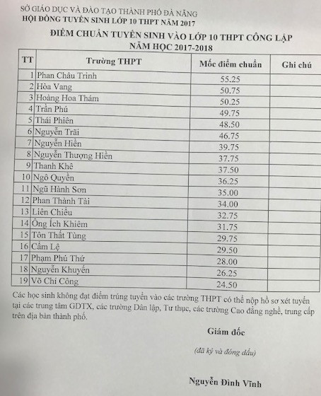 Theo đó, khối các trường THPT công lập, điểm chuẩn vào trường THPT Phan Trinh cao nhất với 55,25 và thấp nhất là trường THPT Võ Chí Công với 24,50 điểm. Trường chuyên Lê Quý Đôn cao nhất là môn chuyên tiếng Anh với 47,25 điểm, thấp nhất là môn chuyên tiếng Pháp với 32,25 điểm.