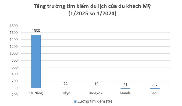 Lượng tìm kiếm từ du khách Mỹ đến Đà Nẵng tăng đột biến 1.538% so cùng kỳ năm 2024, ghi nhận mức tăng trưởng ấn tượng nhất trong số các điểm đến hàng đầu.