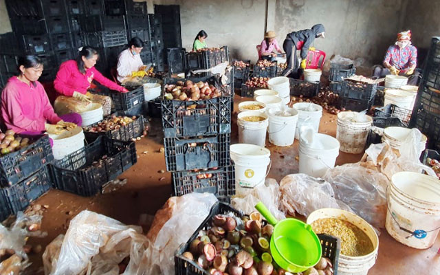Theo dòng nước thải vào trong cơ sở sản xuất, công ty này thuê máy đào một rãnh thoát nước có chiều dài khoảng 40m, rộng 50cm và sâu khoảng 70cm để thoát phế phẩm trực tiếp ra môi trường. Một hố sâu có khả năng chứa hơn 10 m3 phế phẩm phía bên sau cơ sở chế biến đã được công ty thuê máy đào đất lấp đầy. Bên trong một căn phòng của cơ sở chế biến có khoảng tám nhân công đang thực hiện việc sơ chế chanh dây. Tuy nhiên, theo quan sát thì việc chế biến ở đây không bảo đảm các điều kiện an toàn vệ sinh thực phẩm, cụ thể: nhân công không có đồ bảo hộ theo quy định; trên nền nhà có nhiều bùn đất; túi đựng dính bùn đất vứt tràn lan; trái chanh dây dính bùn đất, mốc trắng không được phân loại, rửa sạch mà đem trực tiếp vào sơ chế; nhiều thùng ruột chanh dây sau khi sơ chế không được đậy kín bị côn trùng bu bám…
