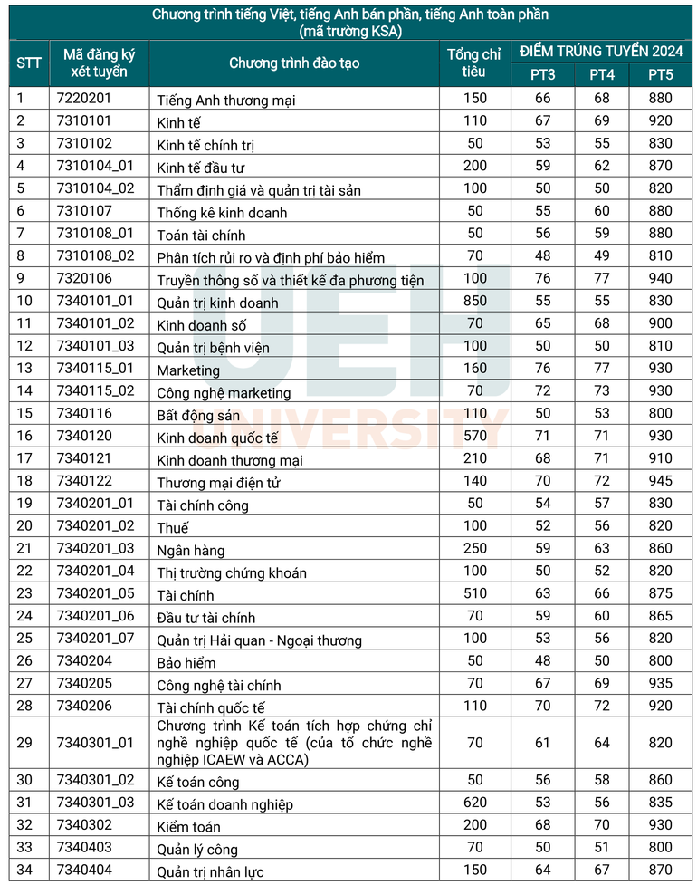 Theo Phó Giáo sư, Tiến sĩ Bùi Quang Hùng, Phó Giám đốc Đại học Kinh tế Thành phố Hồ Chí Minh, mặt bằng điểm chuẩn PT3, PT4 cho thấy đa phần các thí sinh trúng tuyển vào Đại học Kinh tế Thành phố Hồ Chí Minh tập hợp 3 tiêu chí: học sinh giỏi trở lên; sở hữu chứng chỉ tiếng Anh hoặc giải thưởng học sinh giỏi cấp tỉnh/thành phố; thuộc các trường chuyên, năng khiếu.