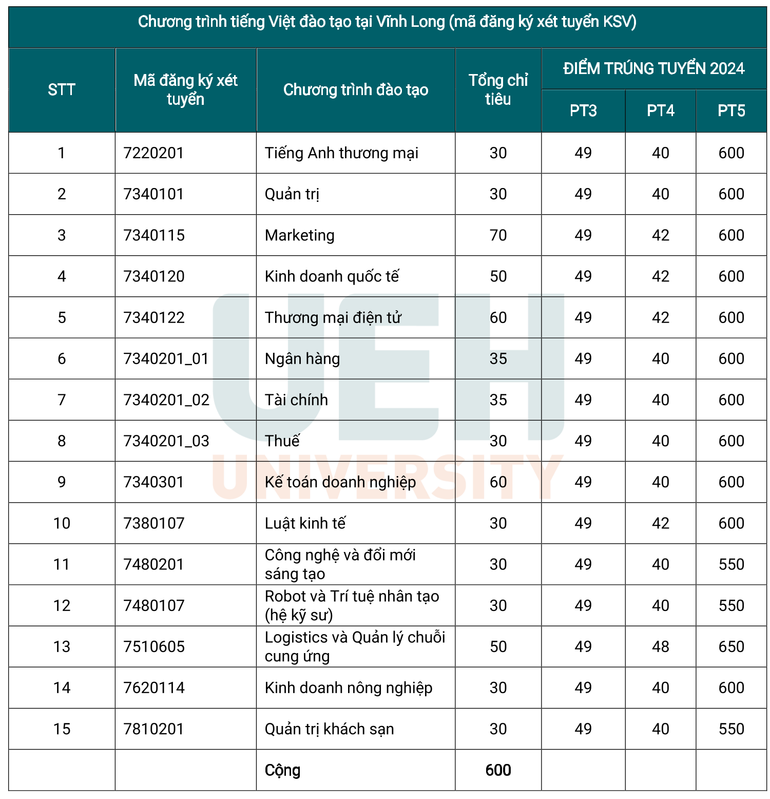 Tại Vĩnh Long (KSV), phổ điểm các PT3, PT4 lần lượt là từ 49, 40, tăng từ 1-8 điểm so với năm 2023 và PT5 là 550-650, tăng 50 điểm. Năm nay, cơ sở này thu hút nhiều thí sinh có kết quả học tập từ loại giỏi trở lên đăng ký hồ sơ xét tuyển.