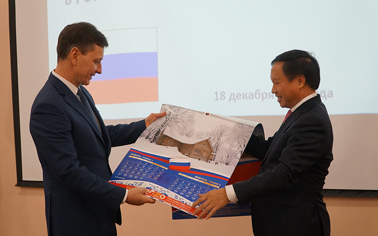 Đại sứ Ngô Đức Mạnh tặng Thống đốc V. Sipyaghin cuốn lịch với những bức ảnh phong cảnh Nga mà đại sứ là tác giả.