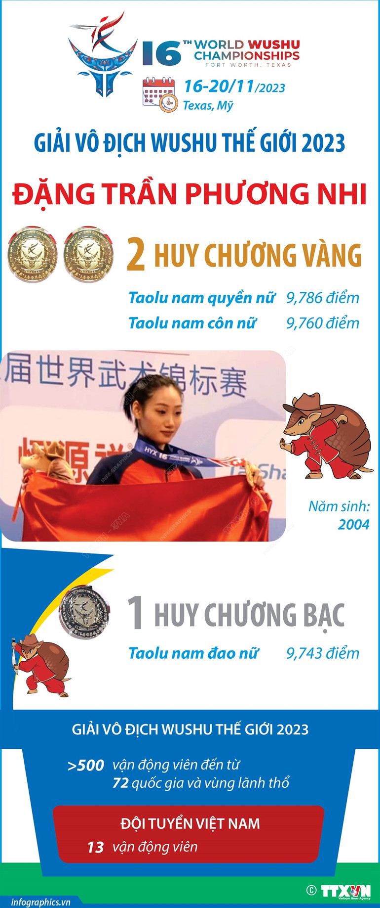 Đội tuyển wushu Việt Nam giành 2 Huy chương Vàng tại Giải vô địch wushu thế giới 2023 bằng màn thể hiện xuất sắc của tuyển thủ Đặng Trần Phương Nhi (nội dung nam quyền nữ và nam côn nữ). Giải vô địch wushu thế giới 2023 diễn ra từ ngày 16-20/11, tại Mỹ.