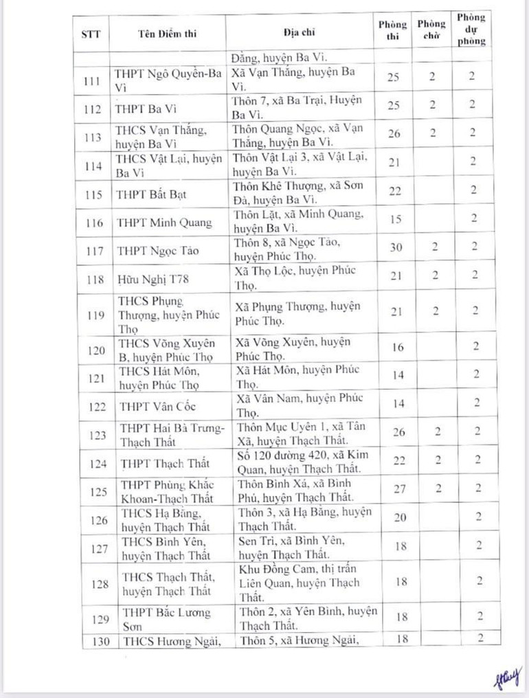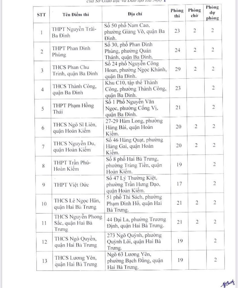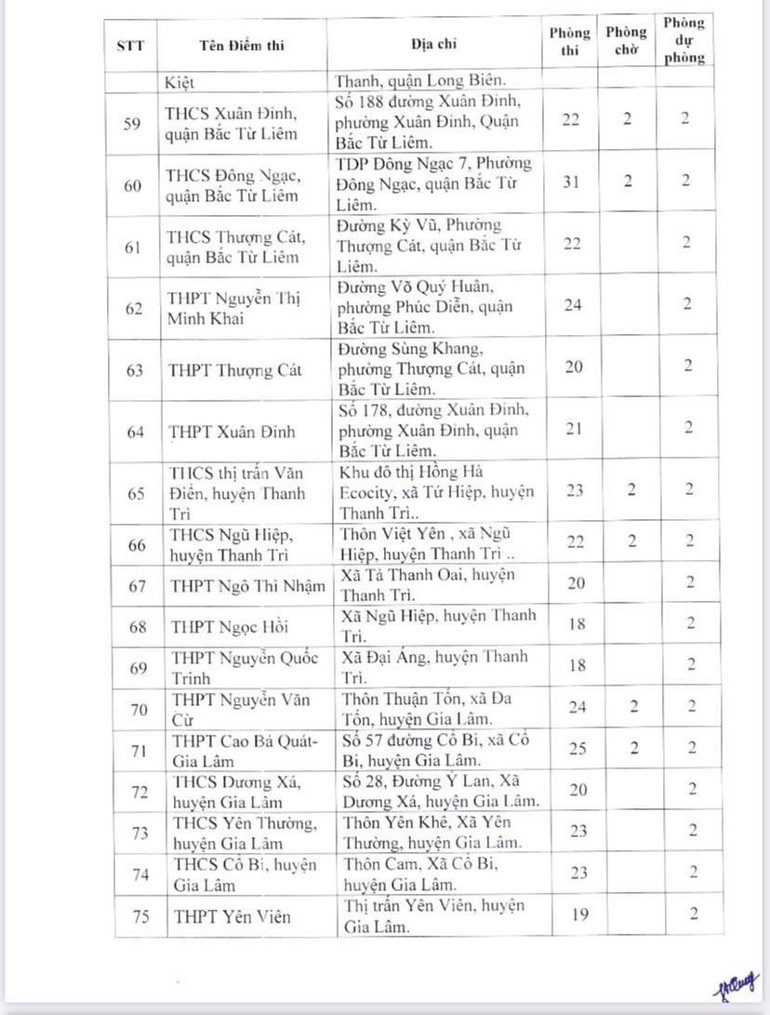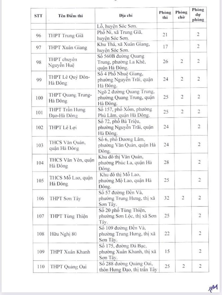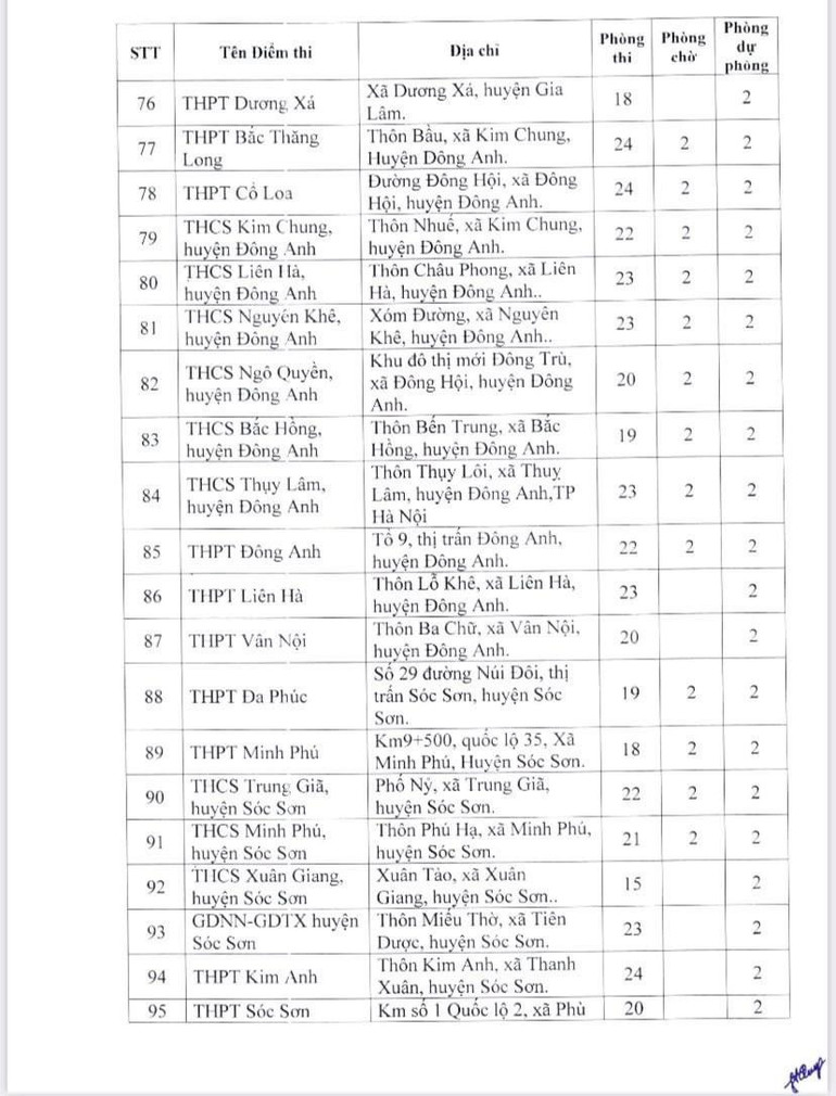 Dưới đây là danh sách 189 điểm thi của Hà Nội: