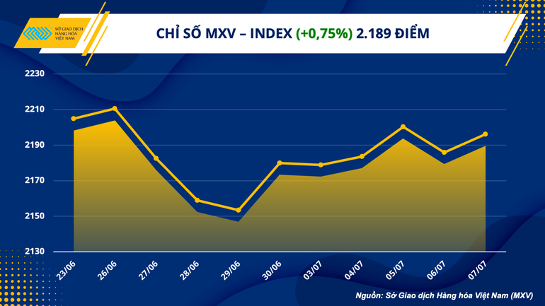 Số liệu từ Sở Giao dịch Hàng hóa Việt Nam (MXV) cho thấy, lực mua chiếm ưu thế trên thị trường hàng hóa nguyên liệu thế giới, hỗ trợ chỉ số MXV-Index đóng cửa tuần vừa qua tăng 0,75% lên 2.189 điểm. Tuy nhiên, trong tuần, thị trường ghi nhận những mức biến động rất mạnh và diễn biến giá hàng hóa liên tục đảo chiều, với 2 phiên giảm và 3 phiên tăng.