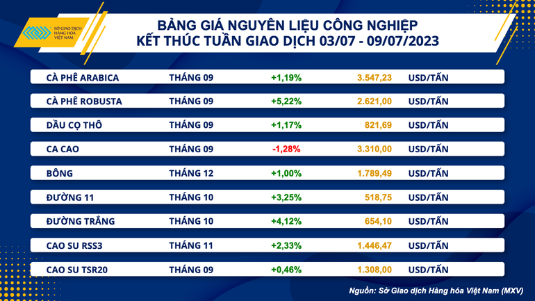 Sắc xanh phủ kín bảng giá các mặt hàng nhóm nguyên liệu công nghiệp với 9 trên 10 mặt hàng đóng cửa tăng giá. Sau 2 tuần giảm liên tiếp do nguồn cung có những tín hiệu tích cực, giá Robusta đã quay lại đà tăng khi đóng cửa tuần cao hơn 5,22% so với tham chiếu. Đà hồi phục trong tuần qua chủ yếu được hỗ trợ từ mức tăng mạnh hơn 4% vào phiên hôm thứ Sáu.