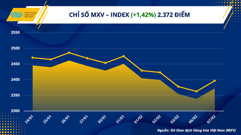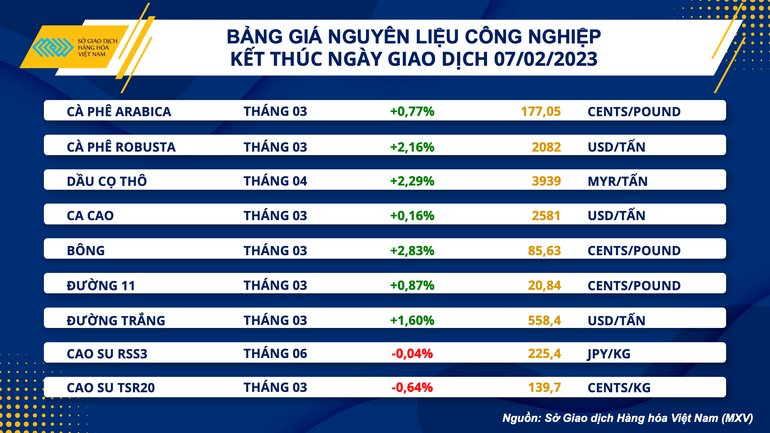Kết thúc phiên giao dịch ngày 7/2, sắc xanh áp đảo trên bảng giá các mặt hàng nhóm nguyên liệu công nghiệp. Đáng chú ý khi hai mặt hàng cà phê tiếp tục đà tăng dù có sự rung lắc mạnh ở đầu phiên giao dịch.