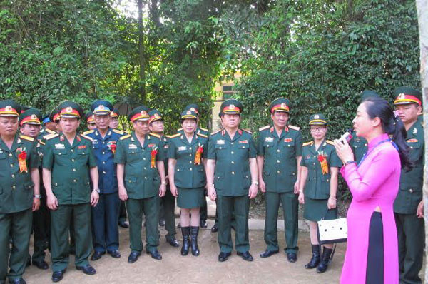 Đoàn đại biểu quân đội nghe thuyết minh tại Khu di tích Kim Liên.