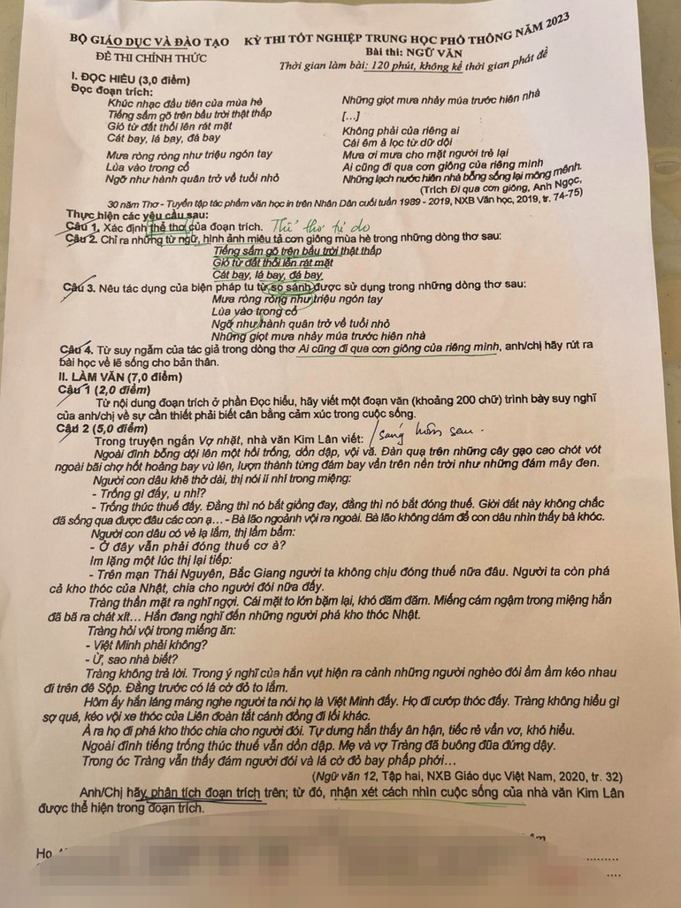 Đề thi chính thức môn Ngữ văn kỳ thi tốt nghiệp Trung học phổ thông 2023