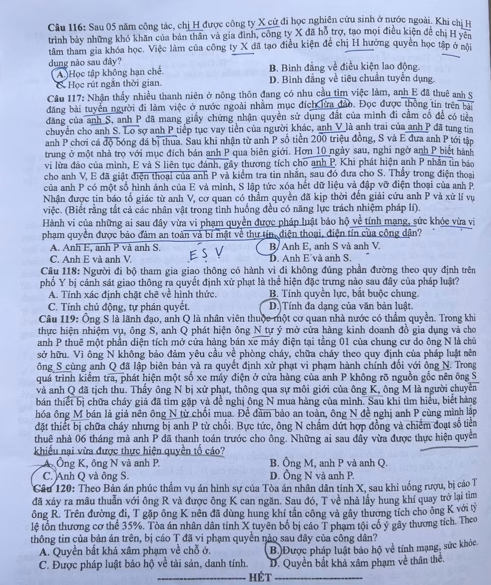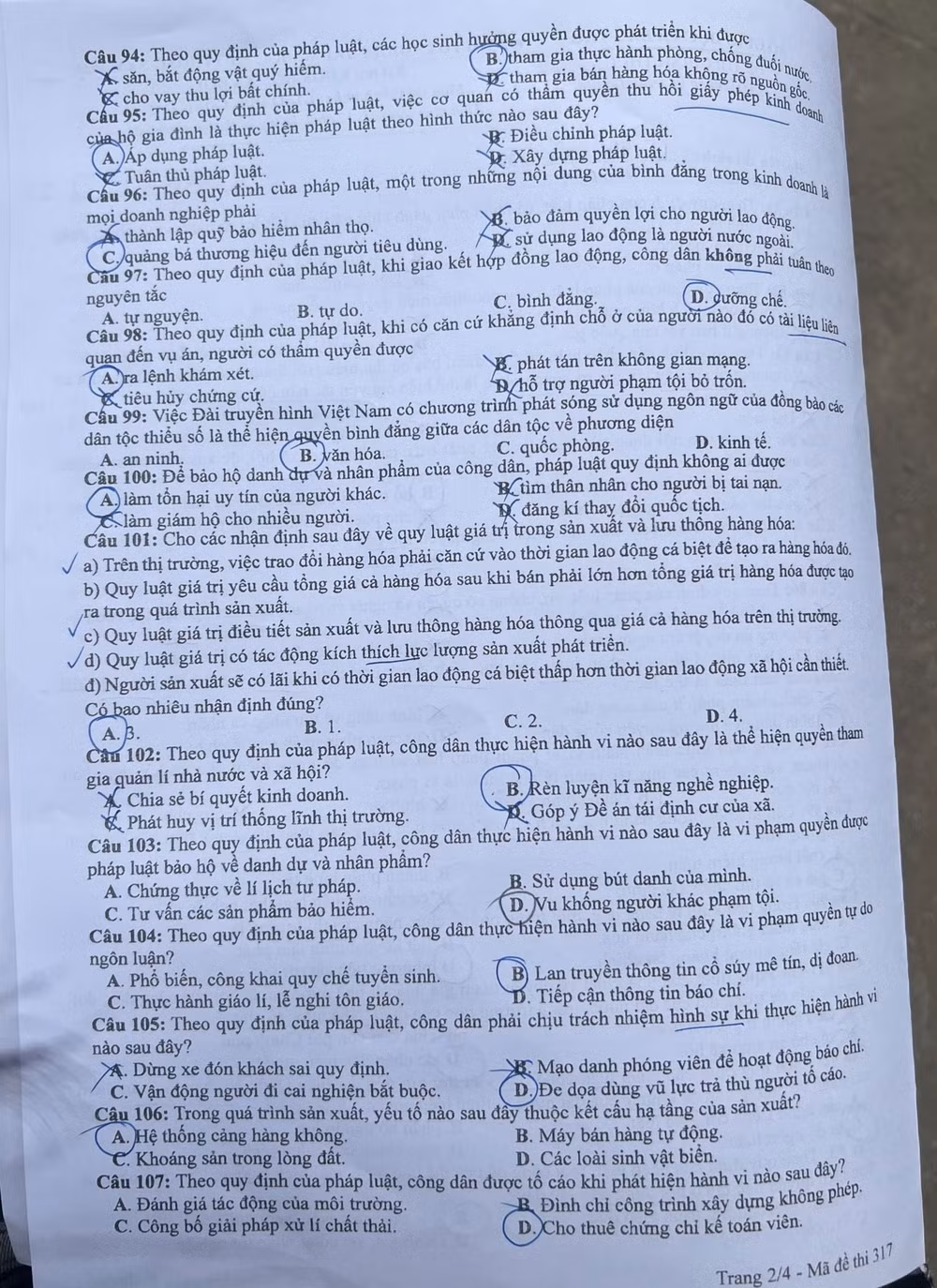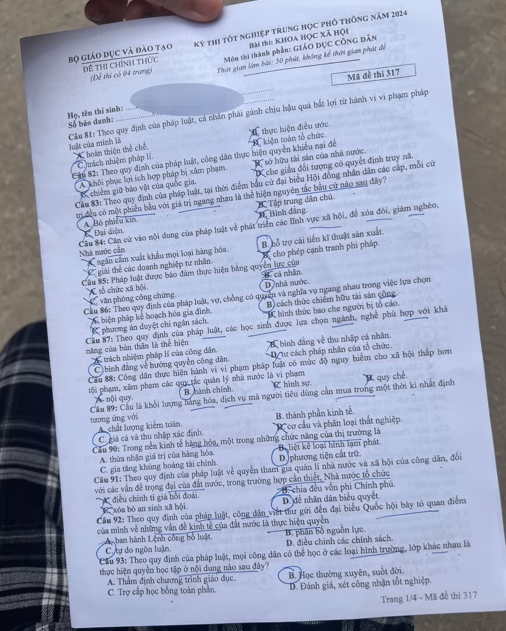 Đề thi môn Giáo dục công dân, mã đề 317 Kỳ thi tốt nghiệp THPT 2024