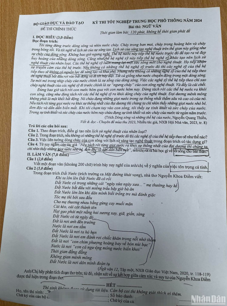 Sáng nay, 27/6, hơn 1 triệu thí sinh trên cả nước đã bước vào Kỳ thi tốt nghiệp Trung học phổ thông năm 2024 với môn thi đầu tiên, môn Ngữ văn, theo hình thức thi tự luận. Báo Nhân Dân xin gửi tới độc giả đề thi môn Ngữ văn.