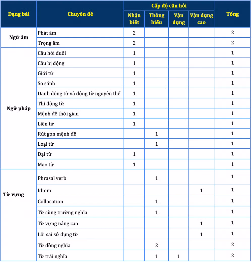 Ma trận đề thi môn Tiếng Anh Kỳ thi tốt nghiệp THPT năm 2024 để thí sinh tham khảo: